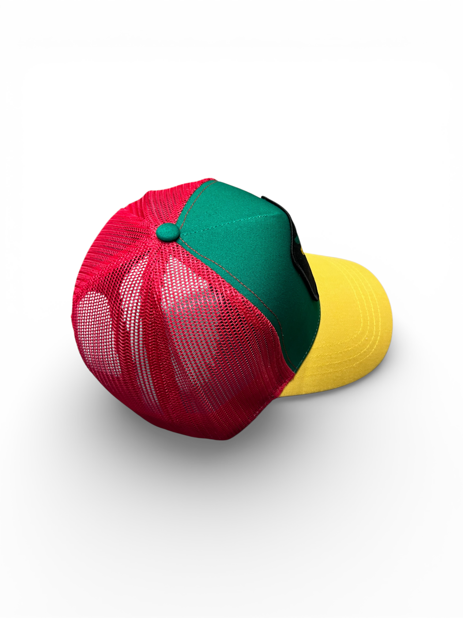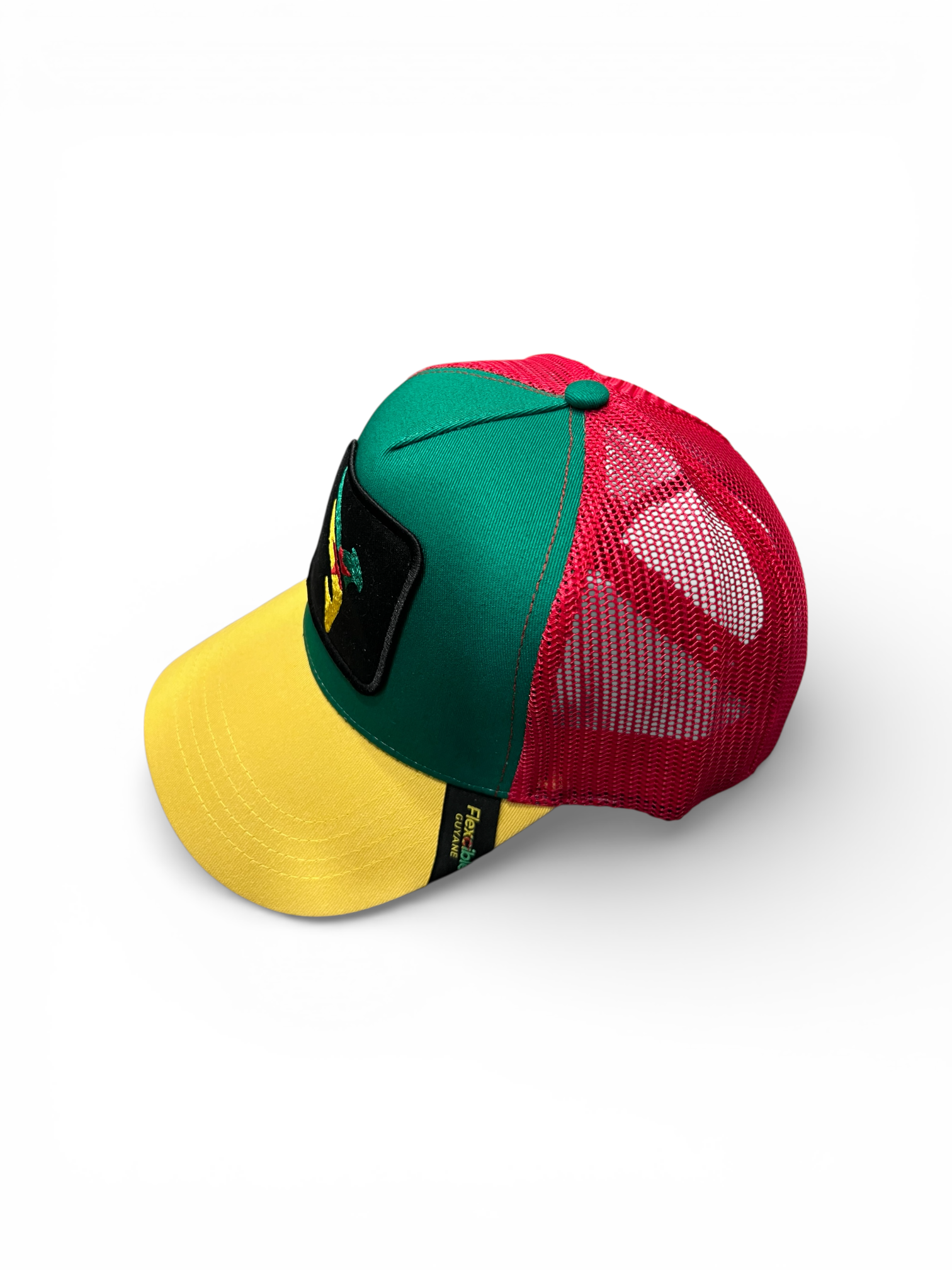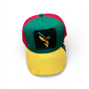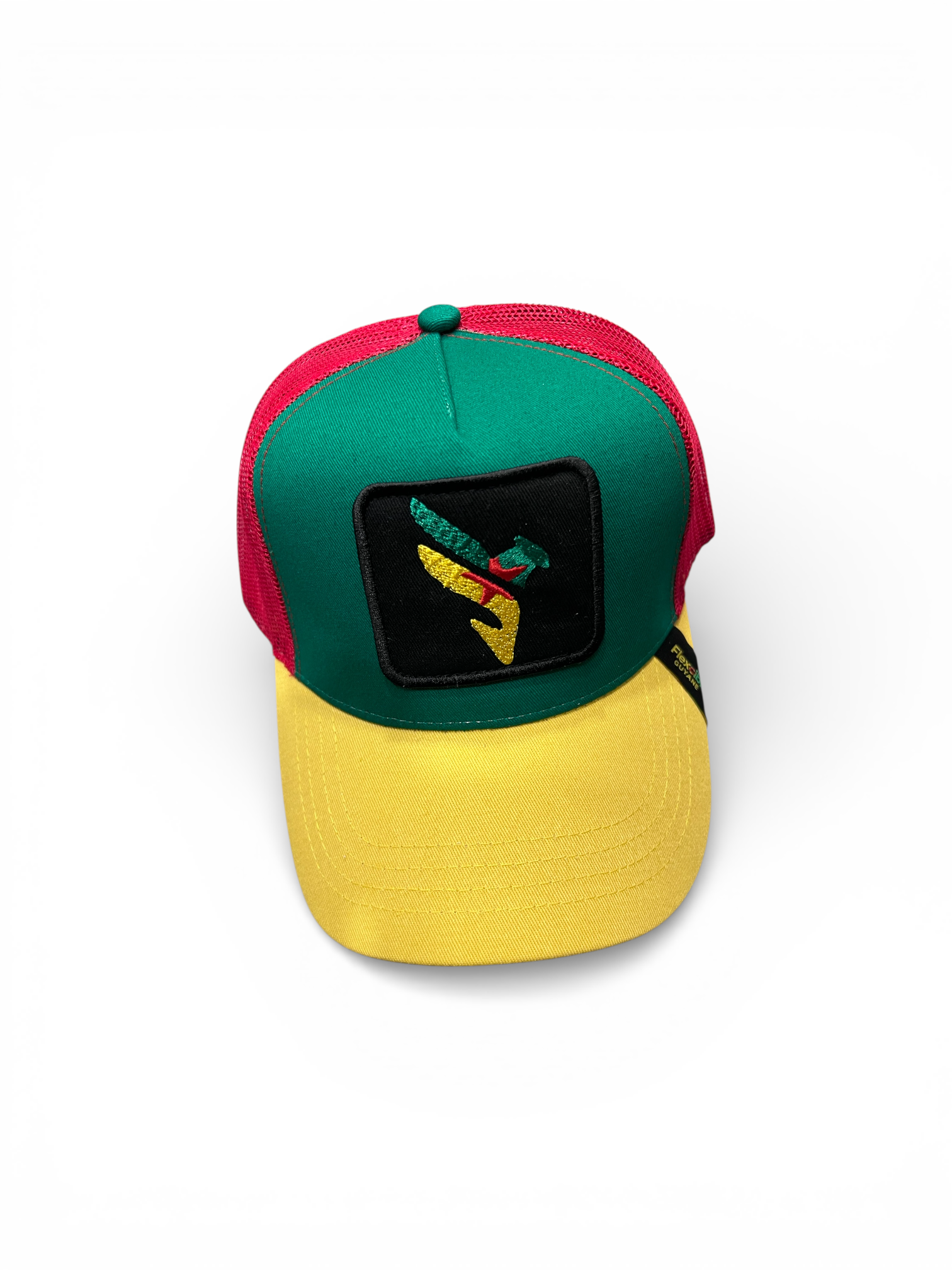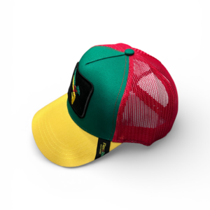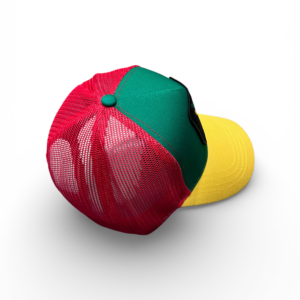 Son visuel audacieux mêlant vert, rouge et jaune rend hommage à la Guyane avec un logo Flexcible brodé en couleur, subtilement mis en valeur sur un patch noir contrasté.