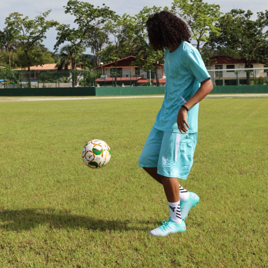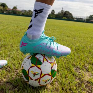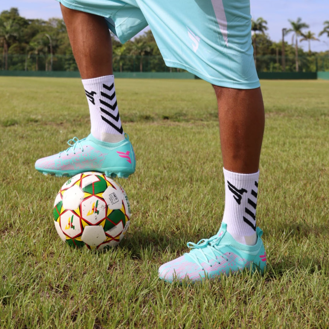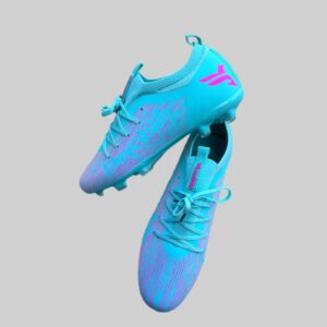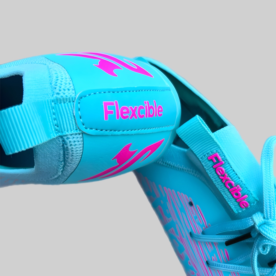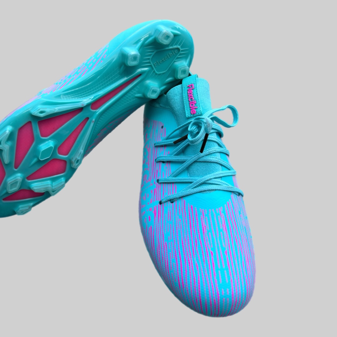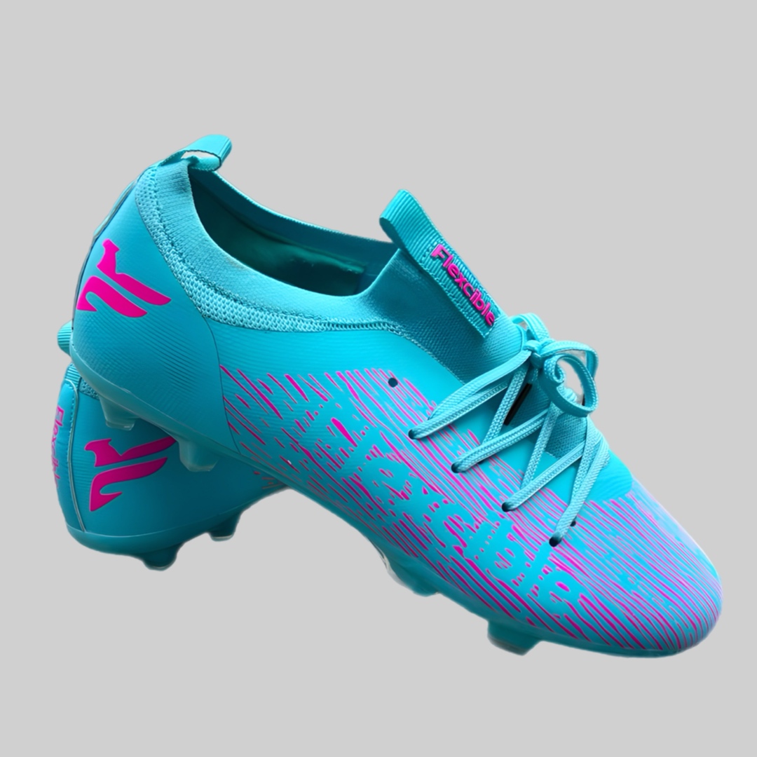 Les Rebel Pro 3 de Flexcible sont des crampons de football pensés pour les joueurs explosifs. Leur design dynamique associe un bleu turquoise vibrant à des accents rose fluo, pour un look audacieux sur le terrain. La tige microfibre texturée optimise le contrôle du ballon, tandis que la semelle extérieure en TPU assure une accroche maximale sur terrains secs et synthétiques. Confort, légèreté et réactivité sont au rendez-vous.